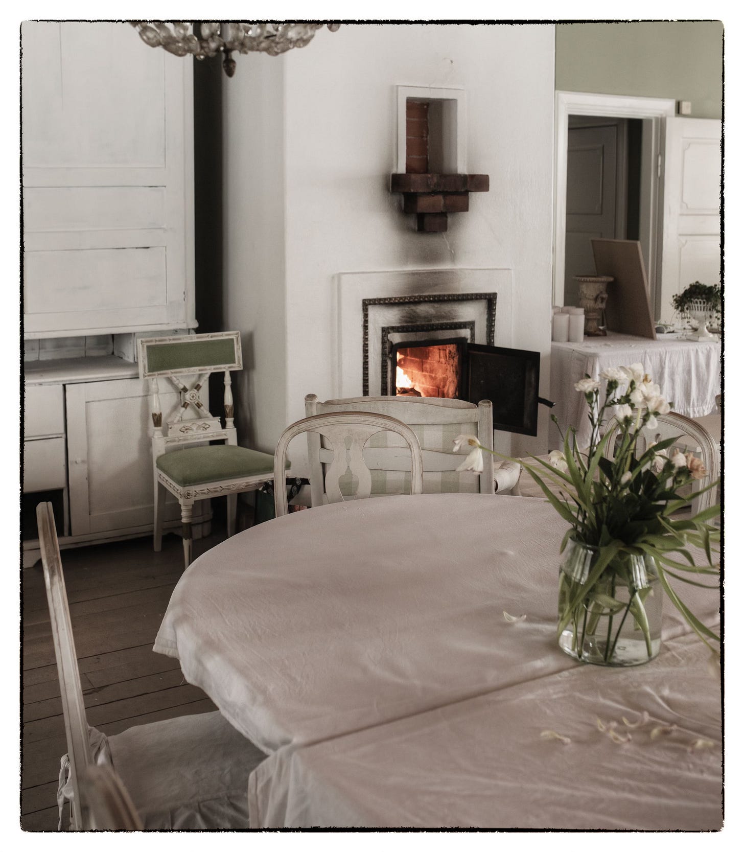An old villa with wide wooden floorboards, a fire crackling in the hearth, a veranda with stone steps for the first milky coffee of the day.